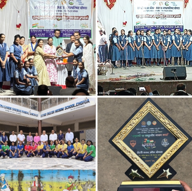 रोटरी क्लब ऑफ चोपडा यांनी आयोजित केलेल्या राष्ट्रभक्तीपर समूह गायन स्पर्धेमध्ये महात्मा गांधी शिक्षण मंडळ संचलित ऑक्सफर्ड इंग्लिश मीडियम स्कूलच्या विद्यार्थ्यांनी प्रथम क्रमांक प्राप्त केला. इयत्ता आठवी ते दहावी साठी असलेल्या शिवम या गटातून त्यांनी सहभाग नोंदविला होता. शर्वरी पाटील, सिद्धी पाटील, दुर्वाक्षी महाजन, खूशी देवरे, खुशल देवरे, वैभवी बाविस्कर, समृद्धी जैस्वाल, ख्याती भाट, पूर्वा देशमुख, कलश क्षीरसागर, गंगोत्री साळी, अन्वी पाटील, स्वरा पाटकर, प्रियांशी पाटील, अक्षदा पाटील व क्षितिजा कोळी आणि या विद्यार्थिनींनी राष्ट्रभक्तीपर गीत गायन स्पर्धेमध्ये सहभागी झाल्या होत्या. या स्पर्धेसाठी शाळेतील संगीत शिक्षिका अश्विनी ढबू आणि किशोर राजपूत यांचे विद्यार्थ्यांना मार्गदर्शन लाभले. दिनांक १५ ऑगस्ट २०२५ रोजी दुपारी एक वाजता ही स्पर्धा नगरपरिषद नाट्यगृह, चोपडा येथे आयोजित करण्यात आली होती. या स्पर्धेमध्ये चोपड्यातील सर्व शाळा व महाविद्यालयांनी सहभाग नोंदविला होता. रोटे. विश्वास दलाल, रोटे. चेतन टाटिया, रोटे. आशिष जयस्वाल, रोटे. संदीप पाटील यांच्या हस्ते विजेत्या स्पर्धकांना पारितोषिक देण्यात आले.