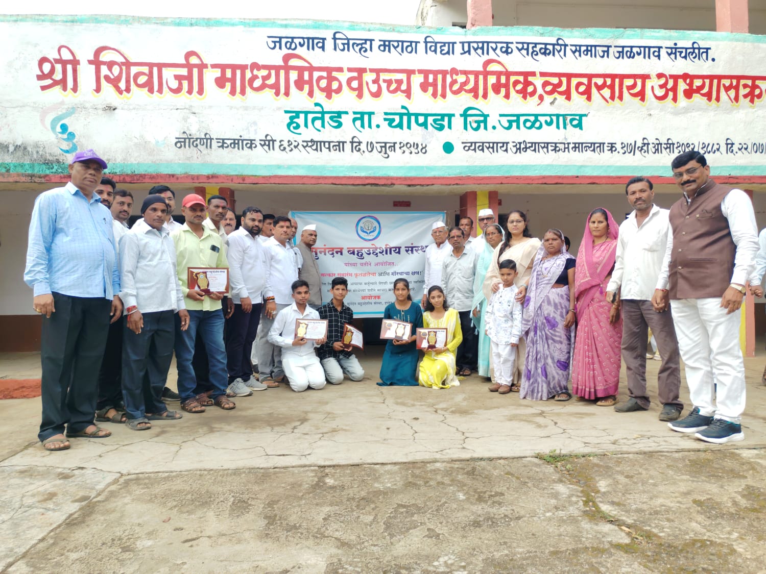 स्वातंत्र्य दिनाचे औचित्य साधून सुनंदन बहुउद्देशीय संस्था हातेड बु यांच्या वतीने हातेड येथिल श्री शिवाजी हायस्कूल चा दहावी व बारावीचा गुणवंत विद्यार्थ्यांचा सत्कार करण्यात आला यावेळी शालेय समितीचे चेअरमन मा. ॲड. सुरेश आनंदराव सोनवणे व मुख्याध्यापक शिक्षक वृंद व शिक्षकेतर कर्मचारी तसेच परिसरातील विविध संस्थांतील पदाधिकारी उपस्थित होते.