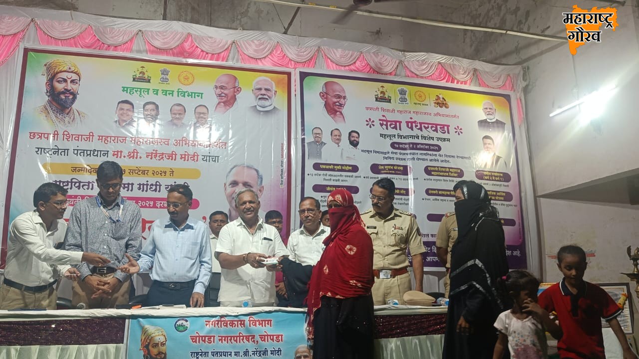 चोपडा ता. दिनांक 27 सप्टेंबर 2025 | स्थळ- न.प नाटयगृह, चोपडा ता. चोपडा राज्य शासनाच्या छत्रपती शिवाजी महाराज महाराजस्व अभियानांतर्गत राष्ट्रनेता मा. नरेंद्रजी मोदी यांचा जन्मदिवस दि. 17 सप्टेंबर 2025 ते राष्ट्रपिता महात्मा गांधी यांची जयंती दि. 02 ऑक्टोबर 2025 दरम्यान सेवा पंघरवडा अंतर्गत चोपडा तालुक्यातील सर्व गावांना एकत्रित महसूल व सर्वसमावेशक शासकीय सेवा तालुका स्तरीय शिबीराचे आयोजन करण्यात आले. उद्घाटन आमदार चंद्रकांत सोनवणे यांच्या हस्ते संपन्न झाले. यावेळी त्यांनी लाभार्थ्यांशी संवाद साधून विविध योजनेचे लाभ व धनादेश प्रदान केले. नागरिक सहभाग व लाभ- शिबिरात 1800 ते 2000 नागरिकांनी उपस्थित राहून विविध योजनांचा लाभ घेतला. शासनाच्या विविध विभागांनी एकत्रितपणे सेवा उपलब्ध करून दिल्यामुळे शहर व ग्रामीण भागातील नागरिकांना त्यांच्या गावातच प्रशासनाची सुविधा सुलभतेने मिळाली. उपस्थित मान्यवर नरेंद्र पाटील, कृउबा सभापती चोपडा, नामदेव पाटील, अध्यक्ष् लाडकी बहीण योजना चोपडा ,दिपक चौधरी व इतर अधिकारी भाऊसाहेब थोरात, तहसीलदार, एन. आर. पाटील , प्रभारी गट विकास अधिकारी, रामनिवास झ्वर, प्रभारी मुख्याधिकारी न. प चोपडा, दीपक साळुंखे तालुका कृषी अधिकारी, मधुकर सावळे पोलिस निरीक्षक चोपडा शहर पो. स्टे, महेश टाक पोलिस निरीक्षक चोपडा ग्रामीण पो. स्टे, प्रमोद वाघ सहा.पोलीस निरीक्षक अड़ावद पोलीस स्टेशन, डॉ. प्रदिप लासुरकर, तालुका वैदयकीय अधिकारी, विरेंद्र राजपुत, उपविभागीय अभियंता चोपडा, महेंद्र पाटील, आगारप्रमुख चोपडा, शाम येवडा उपविभागीय अभियंता हतनुर प्रकल्प चोपडा, योगेश पाटील निवासी नायब तहसिलदार, सैंदाणे नायब तहसिलदार, धनगर नायब तहसिलदार, एस.एल. पाटील नायब तहसिलदार, श्रीमती मेश्राम पुरवठा अधिकारी व महावितरणचे अभियंता ग्रामीण पाणीपुरवठा सर्व तालुका स्तरीय अधिकारी व सर्व महसुल यंत्रणा उपस्थित होते.