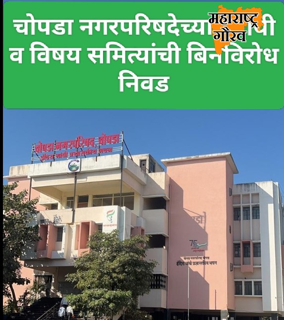 चोपडा, २० जानेवारी २०२६ – चोपडा नगरपरिषदेच्या स्थायी व विषय समित्यांवर नगरपरिषद सदस्यांचे नामनिर्देशन करण्याचा व नगरपरिषद विषय समित्यांवर सभापती पदांच्या निवडणुकीसाठी वार‑सोमवार, दि. १९‑०१‑२०२६ रोजी दुपारी ११‑०० वाजता म. पिठासीन अधिकारी तथा तहसिलदार, चोपडा भाऊसाहेब थोरात सो., यांचे अध्यक्षतेखालील विशेष सभा आयोजित करण्यात आली होती. सभेत म. अध्यक्ष सौ. पाटील नम्रता सचिन, उपाध्यक्ष बोरोले पंकज सुरेश, गटनेता योगेंद्र (पियुष) राजेंद्र चौधरी, रमाकांत नथु ठाकुर, गजेंद्र अरविंद जैस्वाल, देशमुख हितेंद्र रमेश व सन्मा. नगरसेवक असे एकुण ३४ सदस्य हजर होते. तसेच म. मुख्याधिकारी रामनिवास झंवर, उपमुख्याधिकारी संजय मिसर, सभा अधिक्षक संजय ढमाळ, अनिल चौधरी व सर्व विभाग प्रमुख उपस्थित होते.