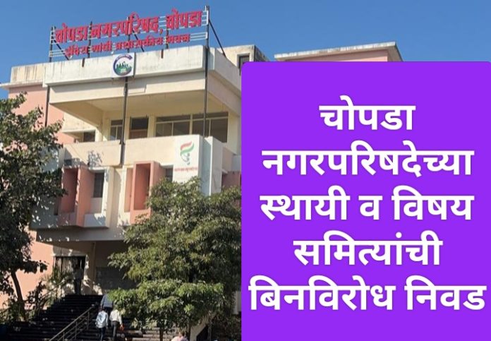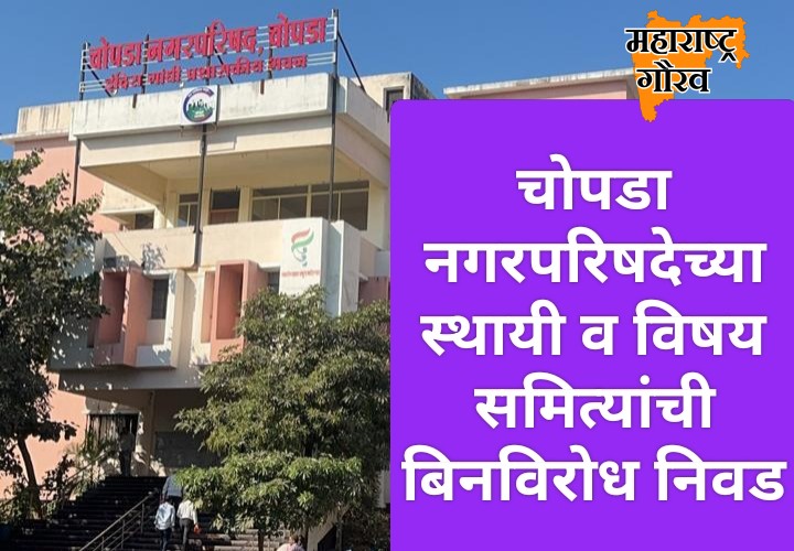 चोपडा, २० जानेवारी २०२६ – चोपडा नगरपरिषदेच्या स्थायी व विषय समित्यांवर नगरपरिषद सदस्यांचे नामनिर्देशन करण्याचा व नगरपरिषद विषय समित्यांवर सभापती पदांच्या निवडणुकीसाठी वार‑सोमवार, दि. १९‑०१‑२०२६ रोजी दुपारी ११‑०० वाजता म. पिठासीन अधिकारी तथा तहसिलदार, चोपडा भाऊसाहेब थोरात सो., यांचे अध्यक्षतेखालील विशेष सभा आयोजित करण्यात आली होती. सभेत म. अध्यक्ष सौ. पाटील नम्रता सचिन, उपाध्यक्ष बोरोले पंकज सुरेश, गटनेता योगेंद्र (पियुष) राजेंद्र चौधरी, रमाकांत नथु ठाकुर, गजेंद्र अरविंद जैस्वाल, देशमुख हितेंद्र रमेश व सन्मा. नगरसेवक असे एकुण ३४ सदस्य हजर होते. तसेच म. मुख्याधिकारी रामनिवास झंवर, उपमुख्याधिकारी संजय मिसर, सभा अधिक्षक संजय ढमाळ, अनिल चौधरी व सर्व विभाग प्रमुख उपस्थित होते.