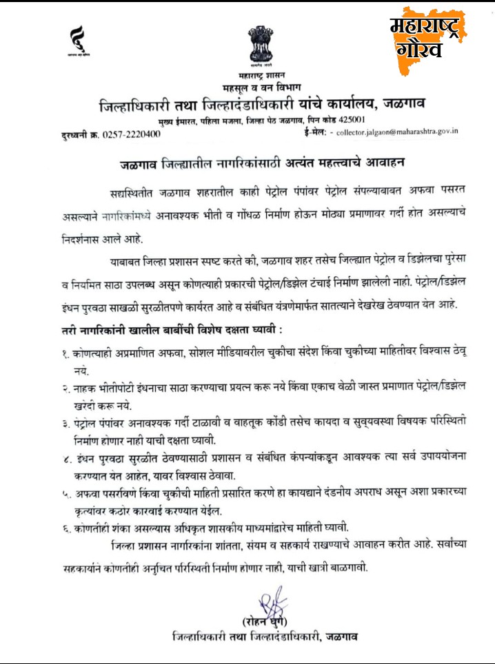 जळगाव: जळगाव शहरातील काही पेट्रोल पंपांवर पेट्रोल संपल्याबाबत अफवा पसरत असल्याने नागरिकांमध्ये अनावश्यक भीती व गोंधळ निर्माण होऊन मोठ्या प्रमाणावर गर्दी होत असल्याचे निदर्शनास आले आहे. याबाबत जिल्हा प्रशासन स्पष्ट करते की, जळगाव शहर तसेच जिल्ह्यात पेट्रोल व डिझेलचा पुरेसा व नियमित साठा उपलब्ध असून कोणत्याही प्रकारची पेट्रोल/डिझेल टंचाई निर्माण झालेली नाही.